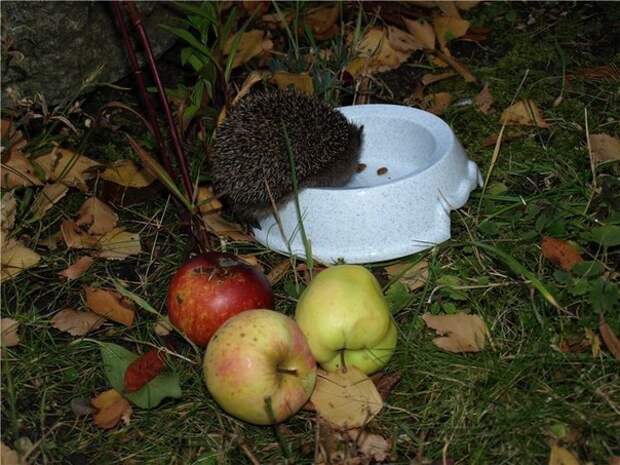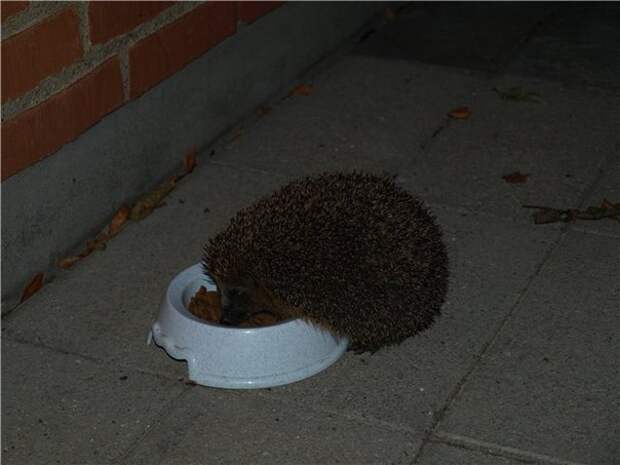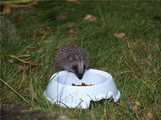 Купила корм для котят (он покалорийнее) и стала его им подкармливать. Корм пришелся ему по вкусу - ел так что треск стоял!!! Сначала ему даже трудно было залезать в чашку и он с нее падал порой. Видите, какой он малюсенький... Каждый вечер я оставляла ему корм, и каждое утро чашка была пустая. Но однажды к корму никто не прикоснулся. Я еще ставила вечерами корм несколько дней, на всякий случай, но уже было ясно - ежик где-то сделал себе норку и наконец-то уснул.