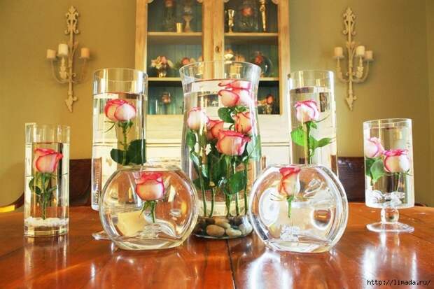 Оригинальная идея, поместить цветы полностью в воду в красивый сосуд. Так цветы дольше сохраняются и смотрятся намного красивее, чем просто в стандартной вазе. Цветы можно помещать группами, по несколько штук.